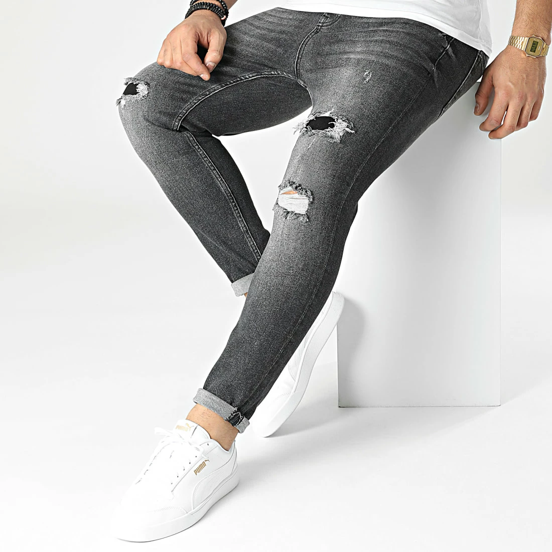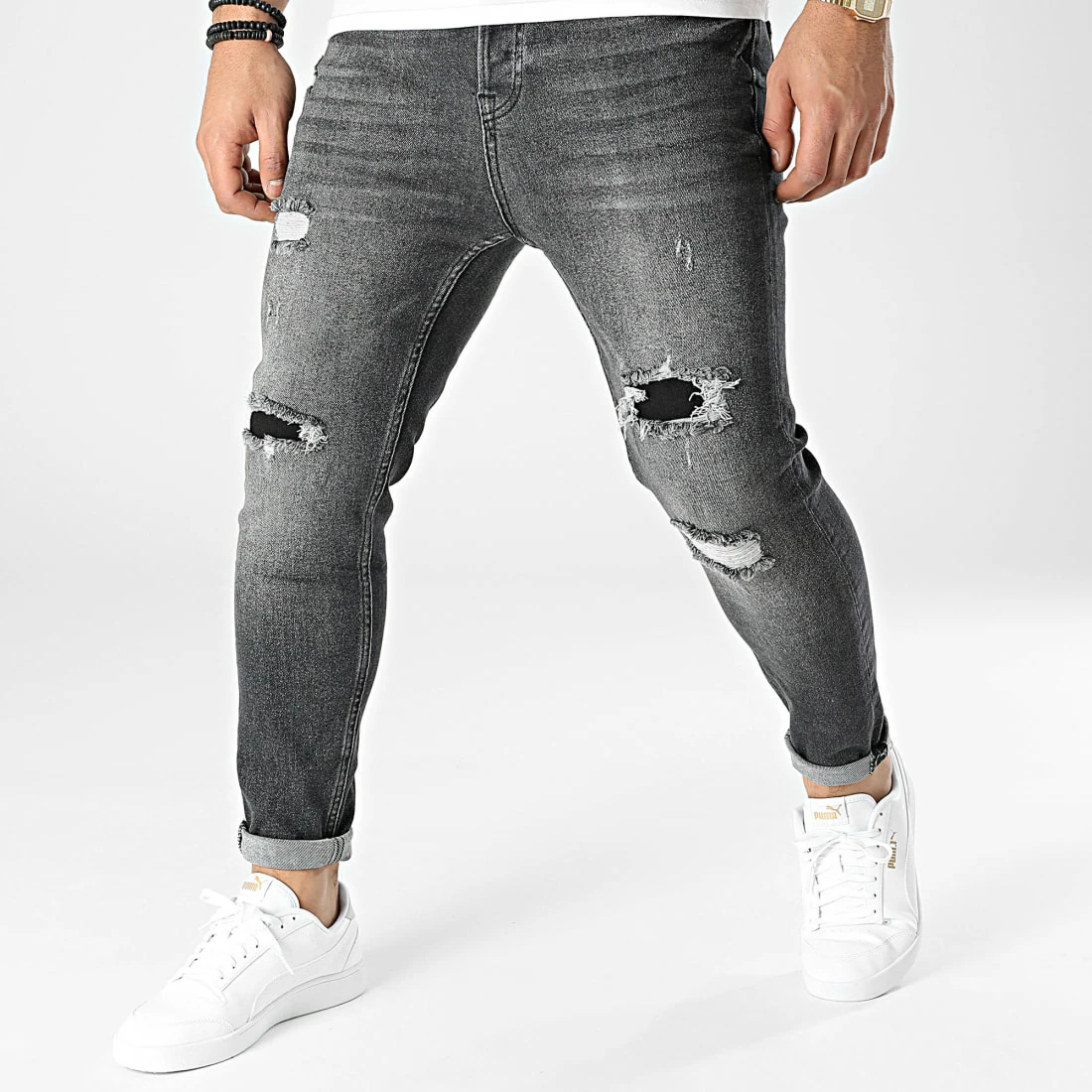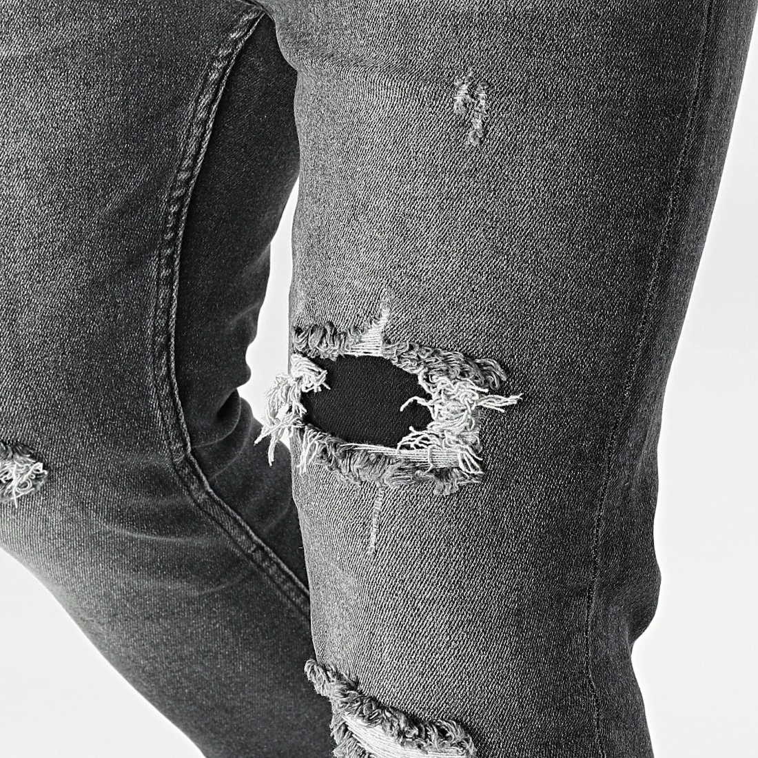 • Jean tendance finition délavée et usée avec rapiéçages