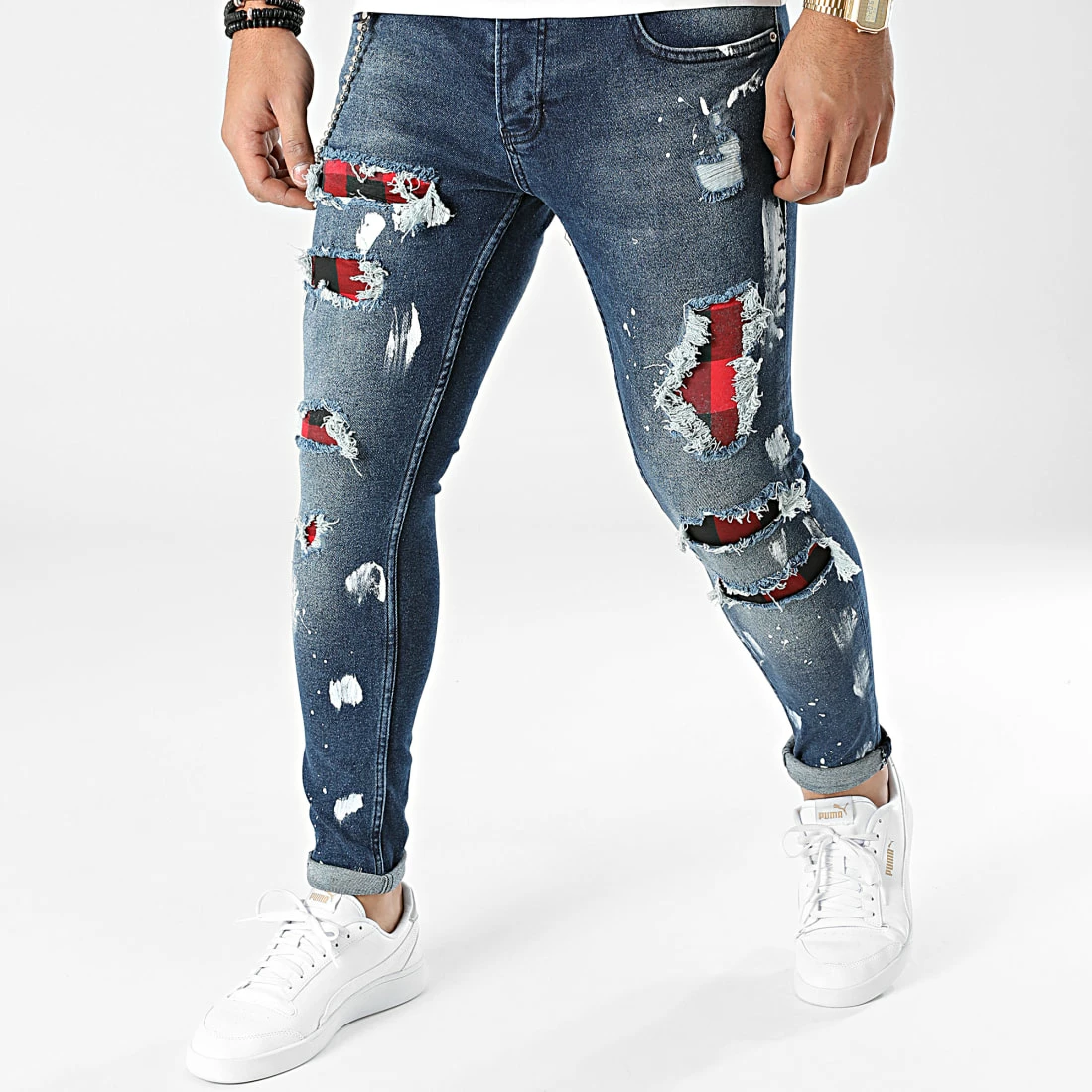 • Jean finition délavée, usée et tachée avec rapiéçages
