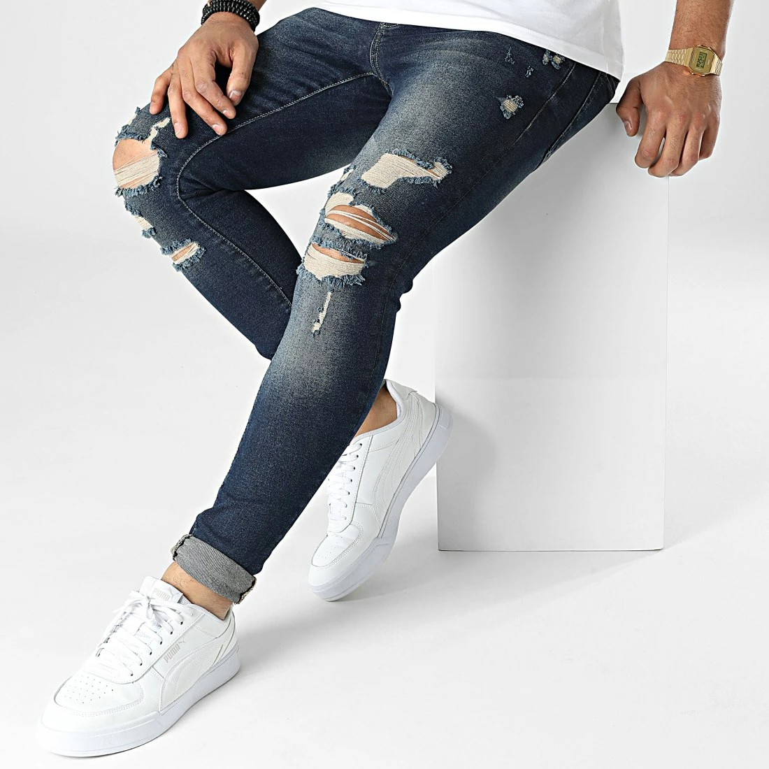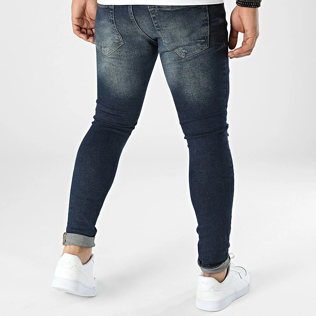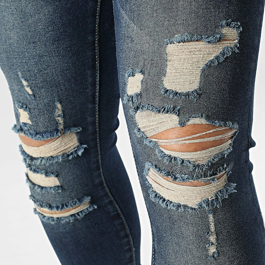 • Jean slim en coton uni finition usée avec rapiéçages